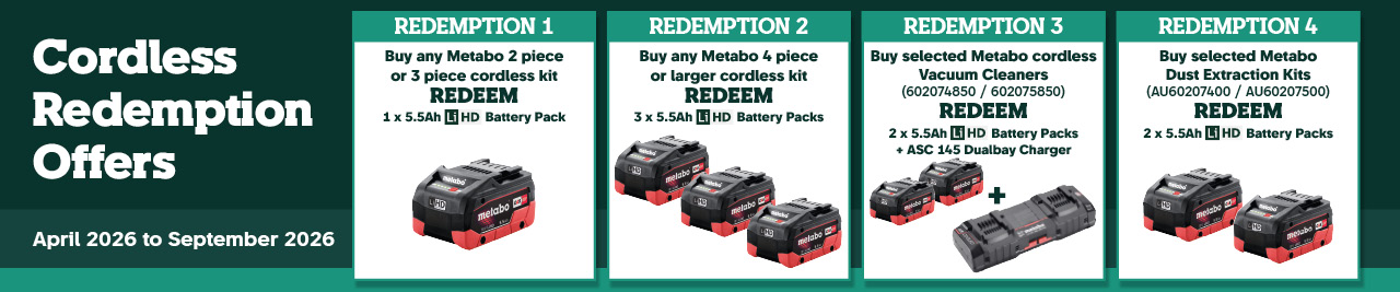 Valid for Metabo cordless tool purchases between 1/4/2026 - 30/9/2026. Last date to redeem 31/10/2026.